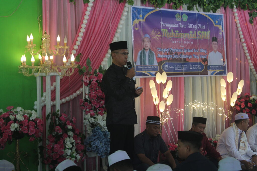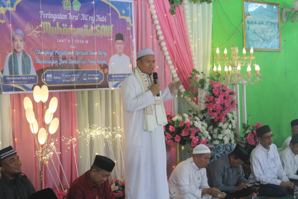 Tamiang Layang, 17/01/2026 (Humas) – Madrasah Tsanawiyah Negeri (MTsN) 1 Barito Timur sukses menggelar peringatan Isra Mi’raj Nabi Muhammad SAW 1447 H pada Sabtu pagi. Bertempat di Langgar Raudhatun Talibin, acara ini berlangsung semarak dengan memadukan nilai spiritual dan edukasi lingkungan.